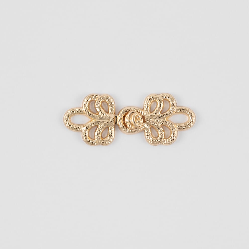Hekte av metallegering. kan vaskes på 40 grader. Gullfarget. Nikkelfri.