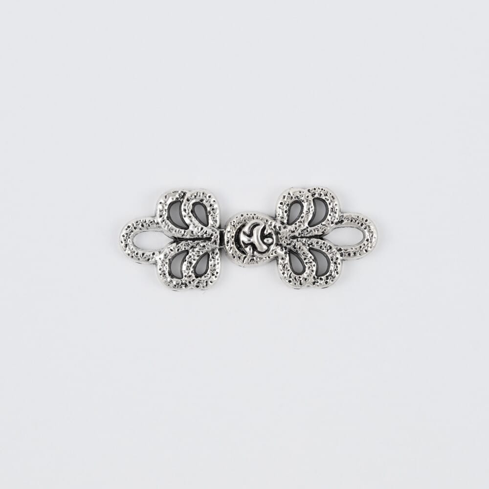 Hekte av metallegering. kan vaskes på 40 grader. Antikk sølvfarget. Nikkelfri.