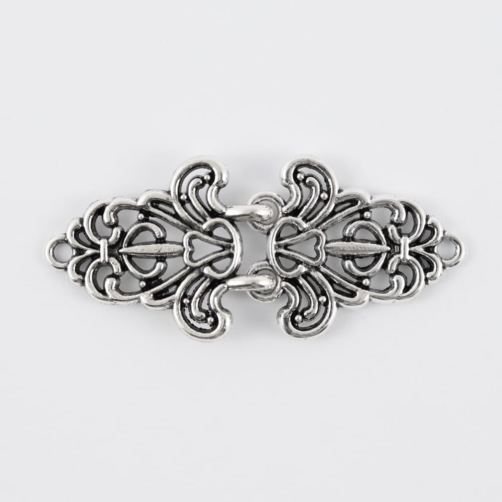 Hekte av metallegering. kan vaskes på 40 grader. Antikk sølvfarget. Nikkelfri.
