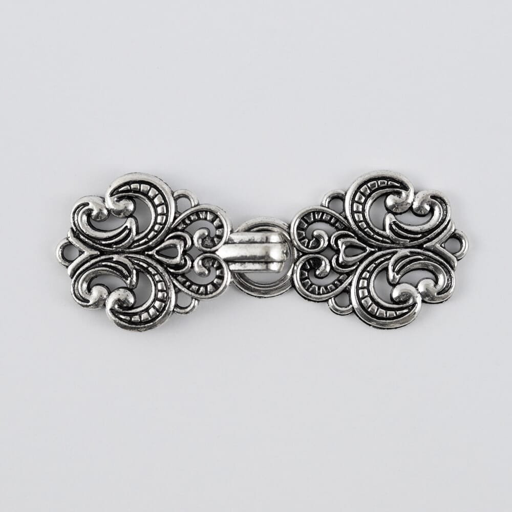 Hekte av metallegering. kan vaskes på 40 grader. Antikk sølvfarget. Nikkelfri.