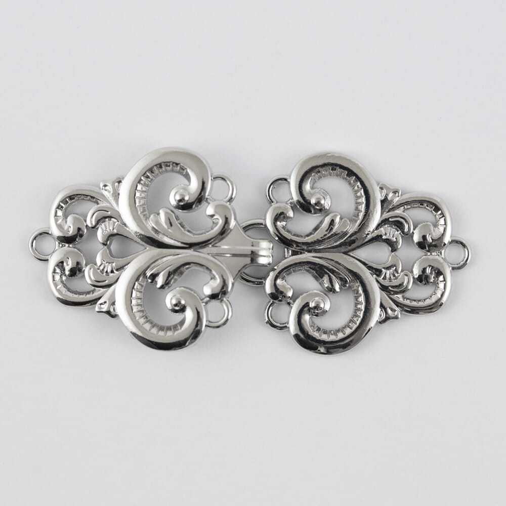 Hekte av metallegering. kan vaskes på 40 grader. Sølvfarget. Nikkelfri.