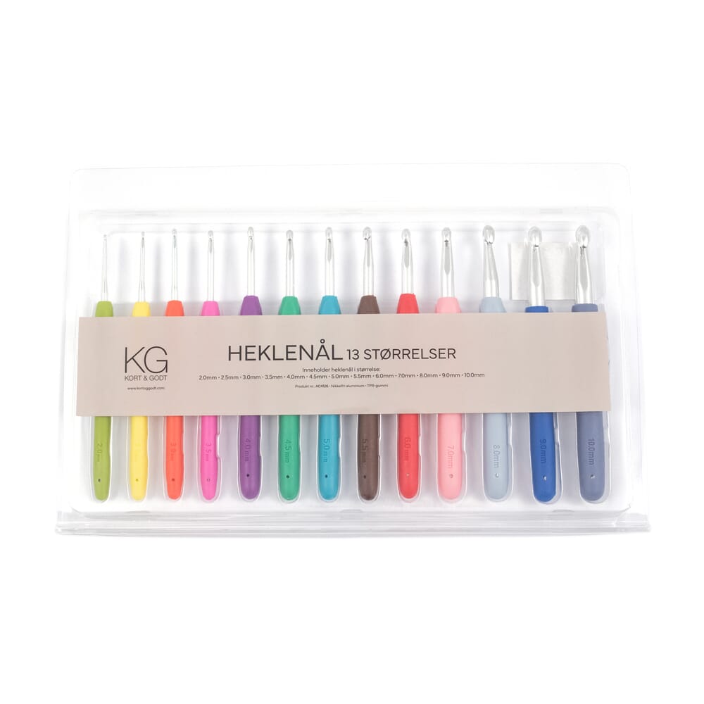 Sett med 13 stk heklenåler laget av aluminium. med ergonomisk skaft i termoplastisk gummi for bedre grep. Heklenålens diameter er angitt på skaftet. Størrelser: 2, 2.5, 3, 3.5, 4, 4.5, 5, 5.5, 6, 7, 8, 9 og 10mm. Nikkelfri.