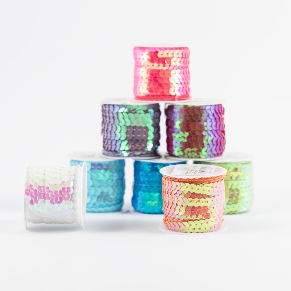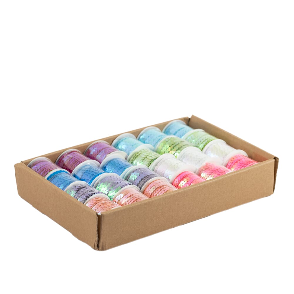 Paljettbånd med shimmer på rull. Kommer i eske med 24 ruller i assorterte farger. Hvit, oransj, rosa, burgunder, lysblå, blå, lilla og grønn.