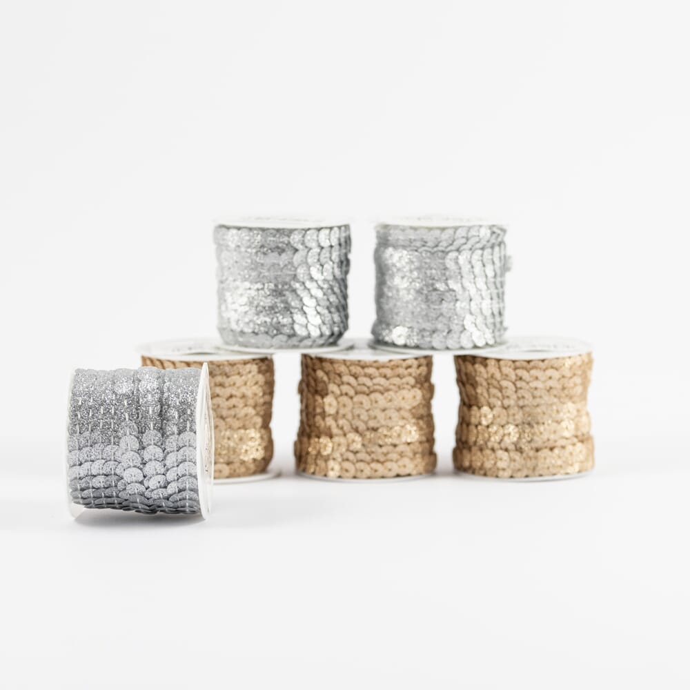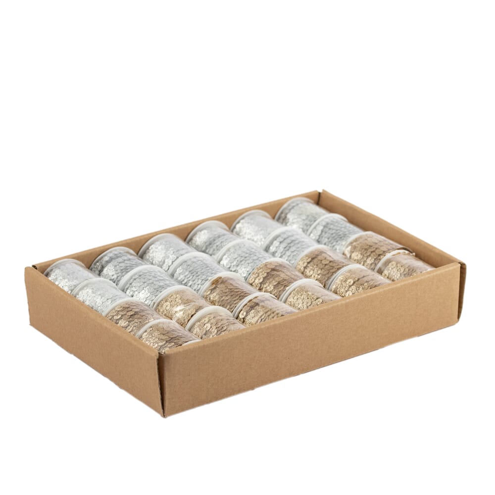 Paljettbånd med glitter på rull. Kommer i eske med 24 ruller, 12 i sølv og 12 gull.