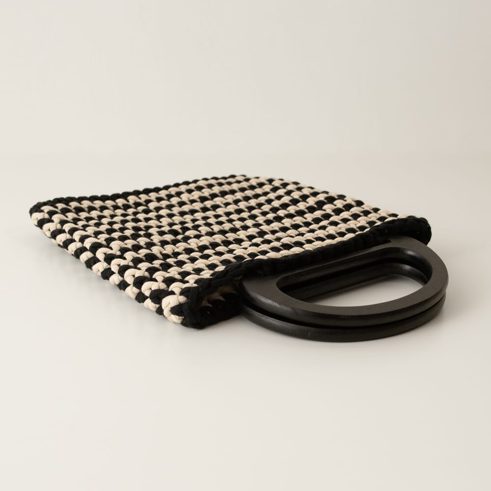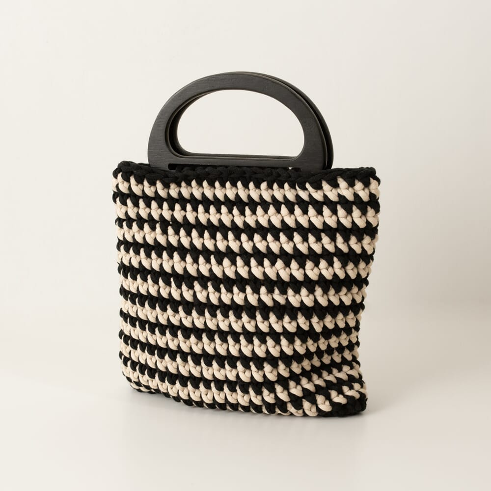 Materiale: Tubegarn 4mm TB134 - 1 nøste/100 gr. TB102 - 1 nøste /100gr Veiledende pinne: Heklenål 6mm Heklefasthet: 10 fastmasker x 10 omganger = 10x10cm Mål: Lengde: 23cm Høyde: 23cm Tilbehør: Veskehåndtak 2 stk. VH1024