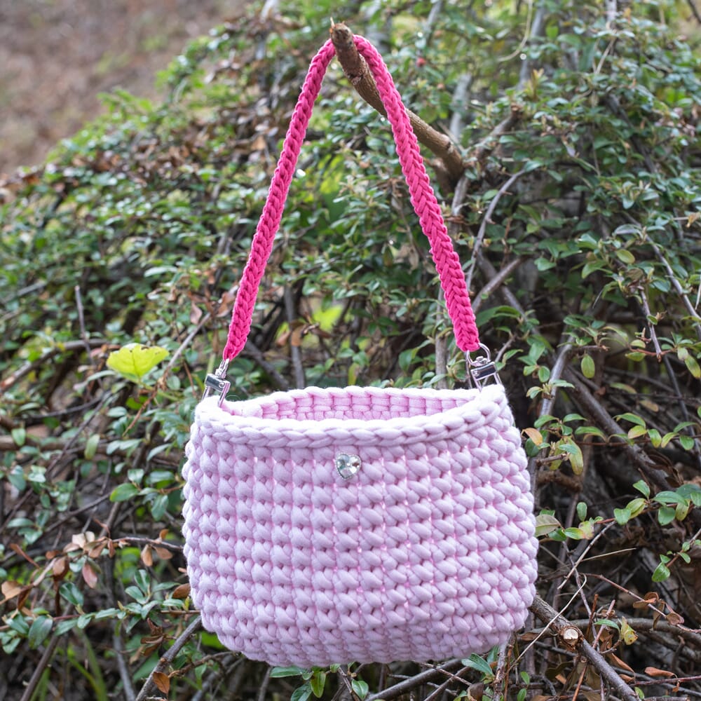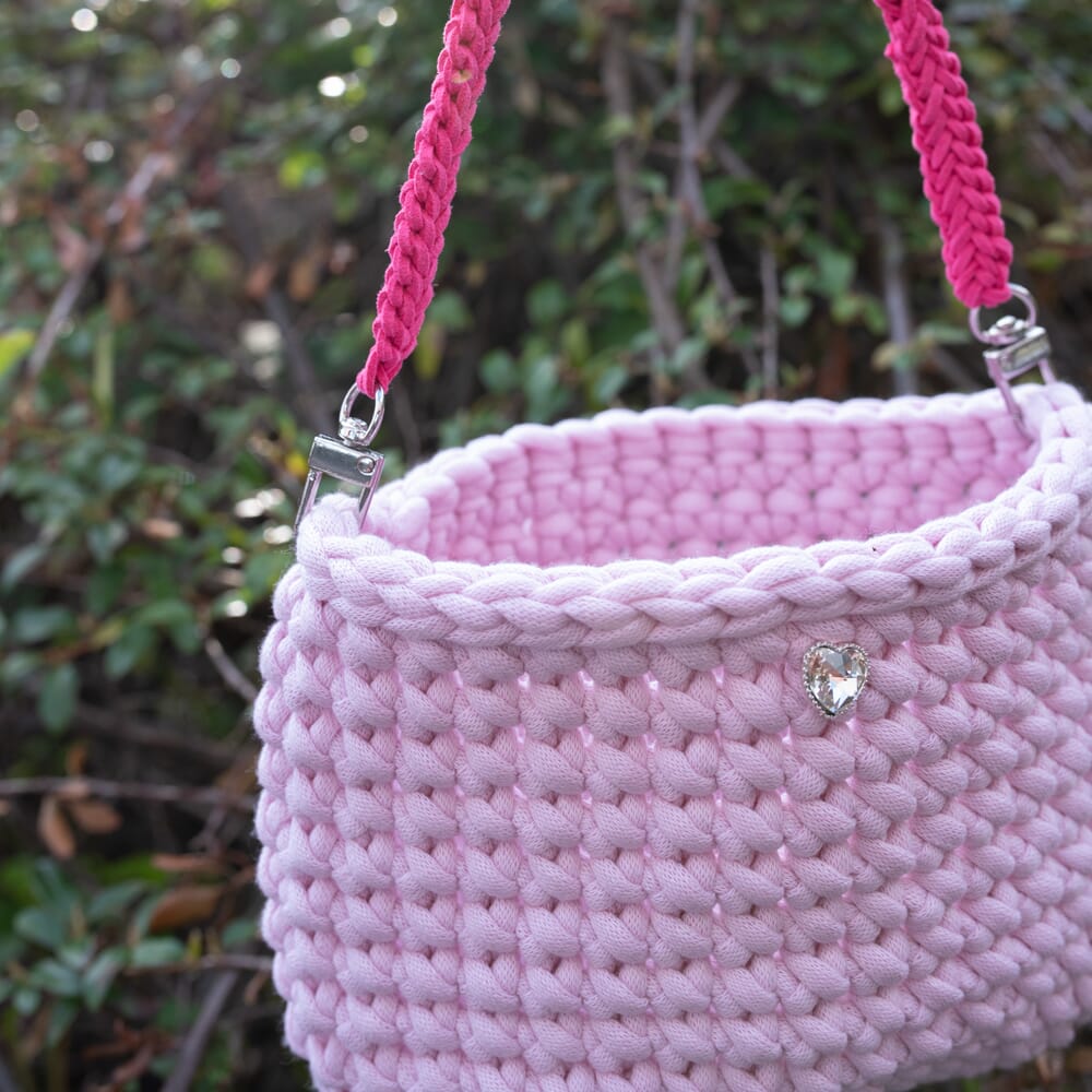 Materiale: Tubegarn 4mm - TB107 1 nøste (100gr) Veiledende pinne: Heklenål 6mm Heklefasthet: 10 fastmasker x 11 omganger = 10x10cm Mål: Bredde: 20cm Høyde: 15cm Tilbehør: AC4019 Karabin 2stk. PIN1001 Bling Hjerte