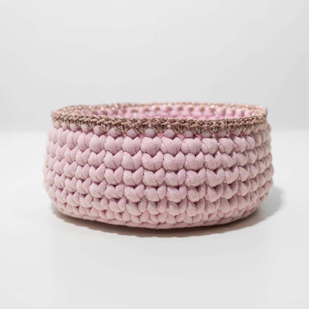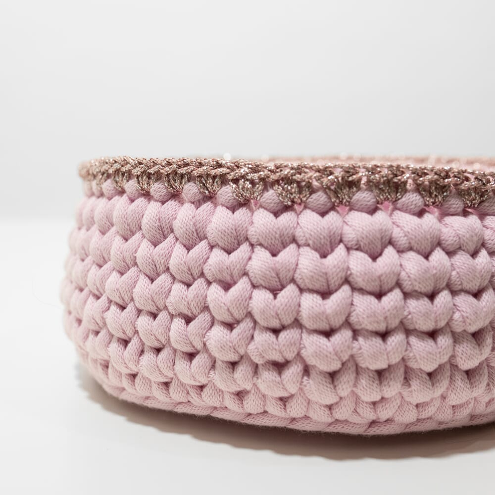 Materiale: Tubegarn 4mm - TB107 1 nøste (100gr) Smykketråd - TR342 6 meter Veiledende pinne: Heklenål 6mm og 3mm Heklefasthet: 9 fastmasker x 12 omganger = 10x10cm Mål: Diameter: 16cm Høyde: 7cm