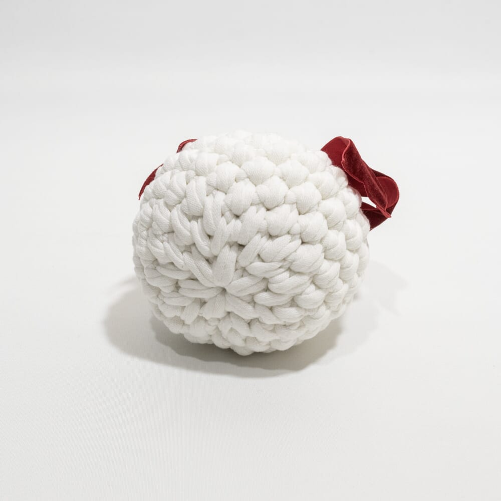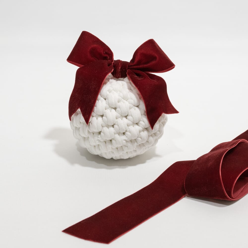 Materiale: Tubegarn 4mm TB100 1 nøste Veiledende pinne: Heklenål 6mm Heklefasthet: 10 masker x 12 omganger = 10x10cm Mål: Diameter: 33cm Høyde: 10cm Tilbehør: Fløyelsbånd RI408 70cm. Fyllvatt