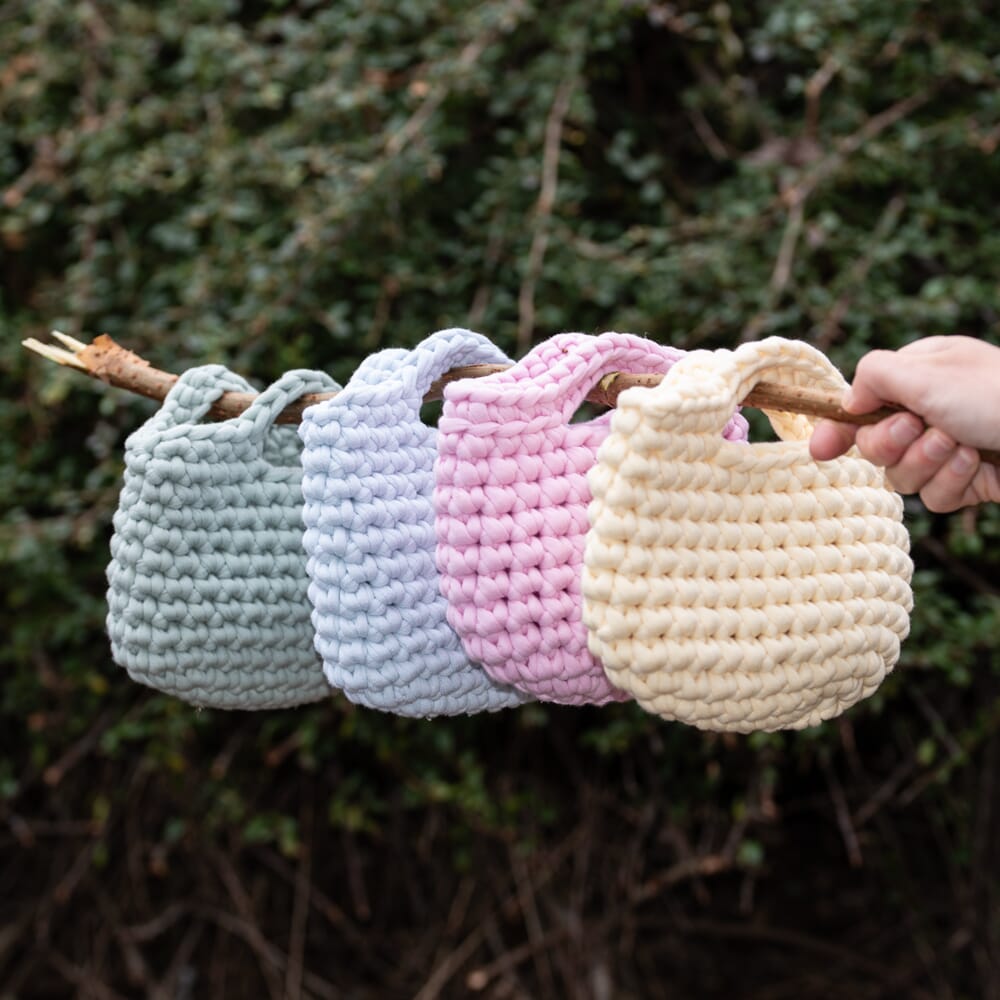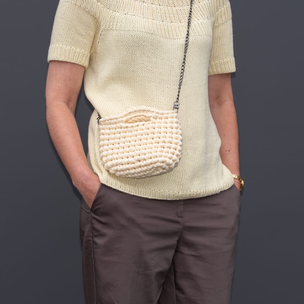 Materiale: Tubegarn+ 7mm - TB123 1 nøster (120gr) Veiledende pinne: Heklenål 8mm Heklefasthet: 7.5 fastmasker x 8 omganger = 10x10cm Mål: Bredde: 19cm Høyde: 16cm Tilbehør: VH1013 - Veskekjede