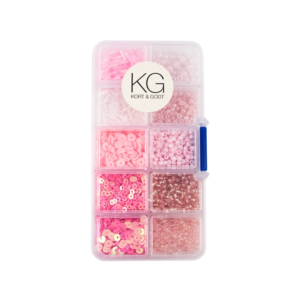 Perleskrin med 10 forskjellige størrelser og farger paljetter og glassperler med hull.