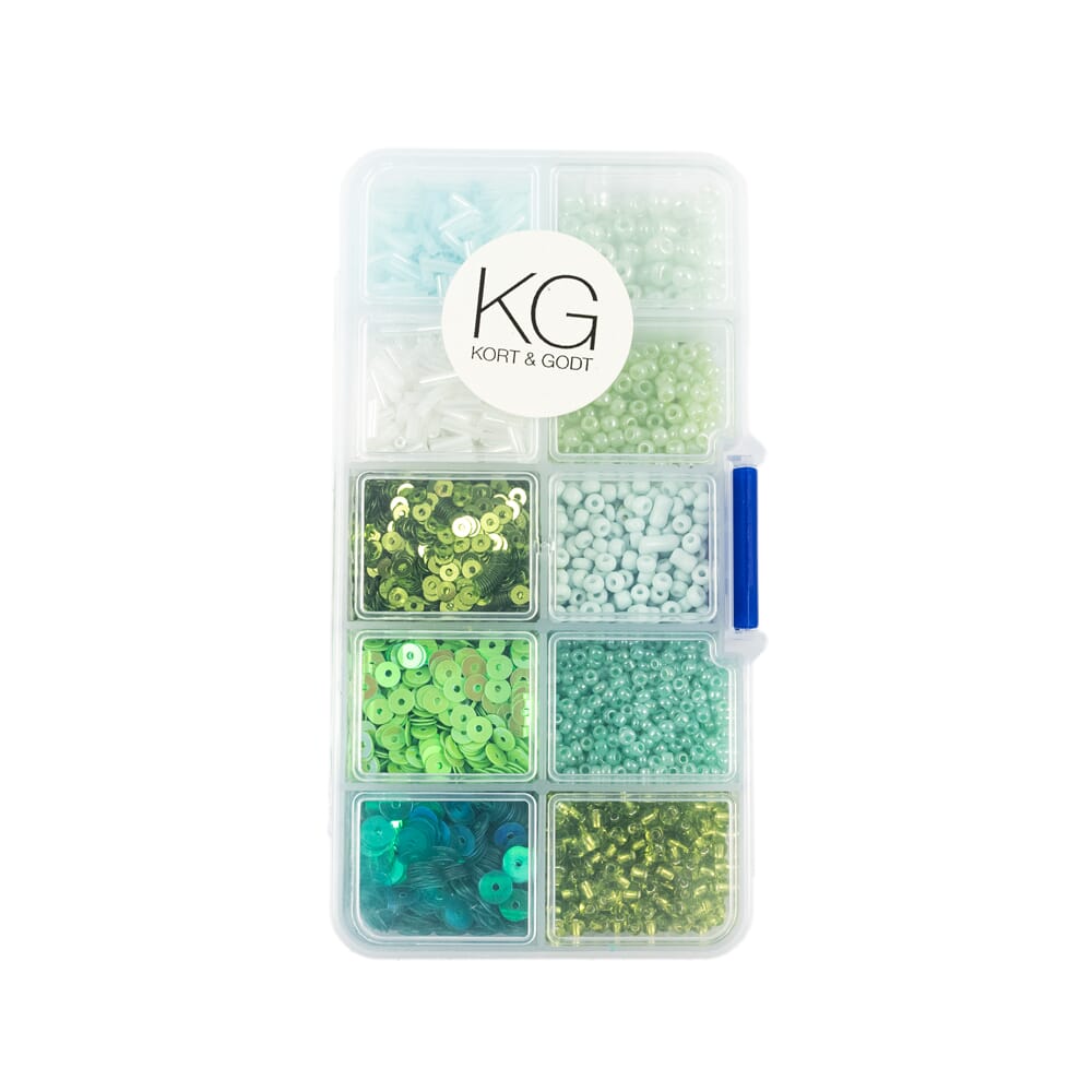 Perleskrin med 10 forskjellige størrelser og farger paljetter og glassperler med hull.