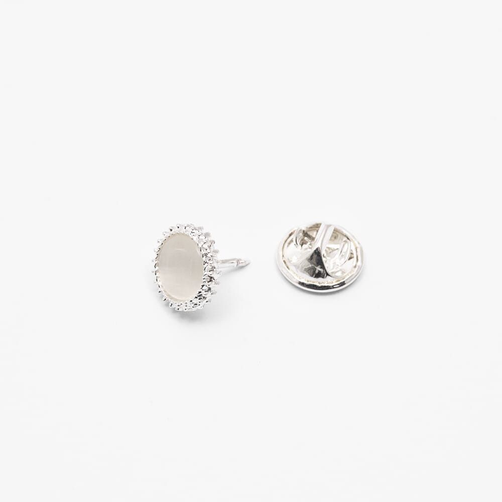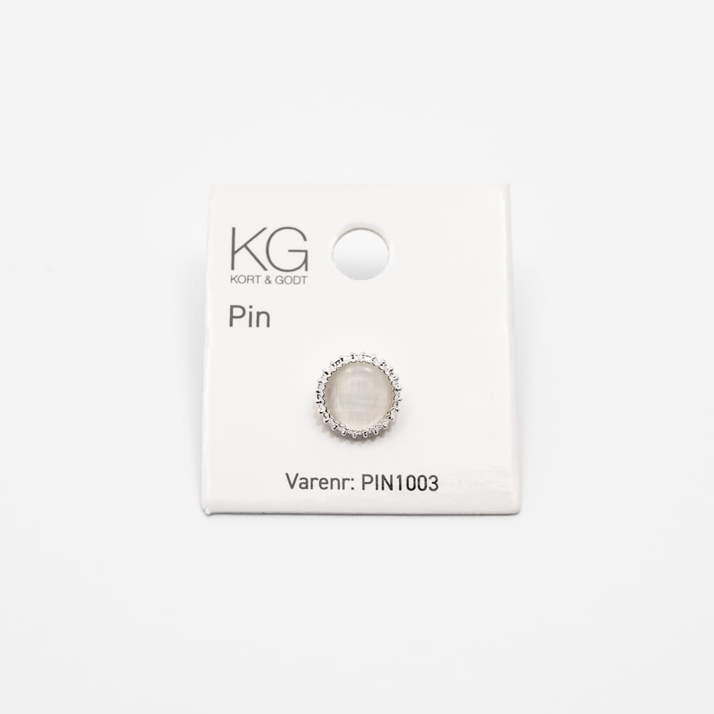"Pin i sølvfarget metall. Med lås til å feste i skjerf, holde sammen cardigan, for store utringninger eller pynte opp plagg. Nikkelfri. Håndvask."