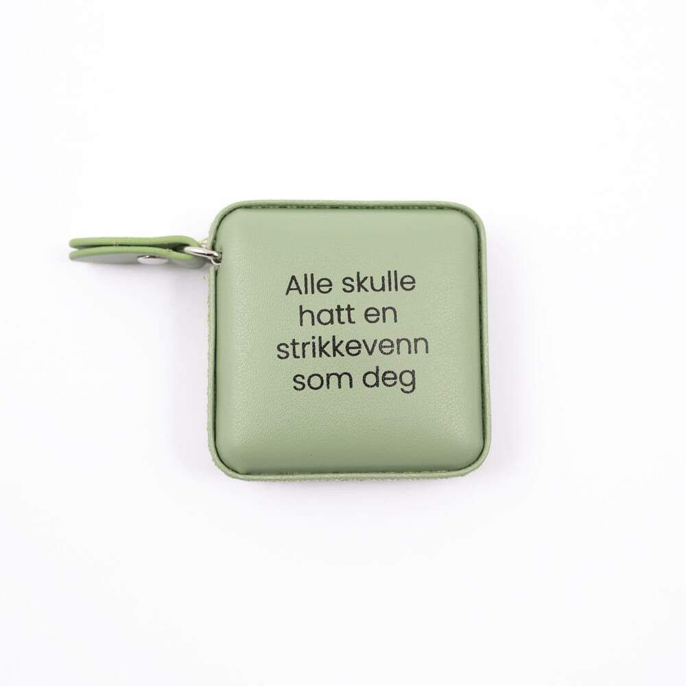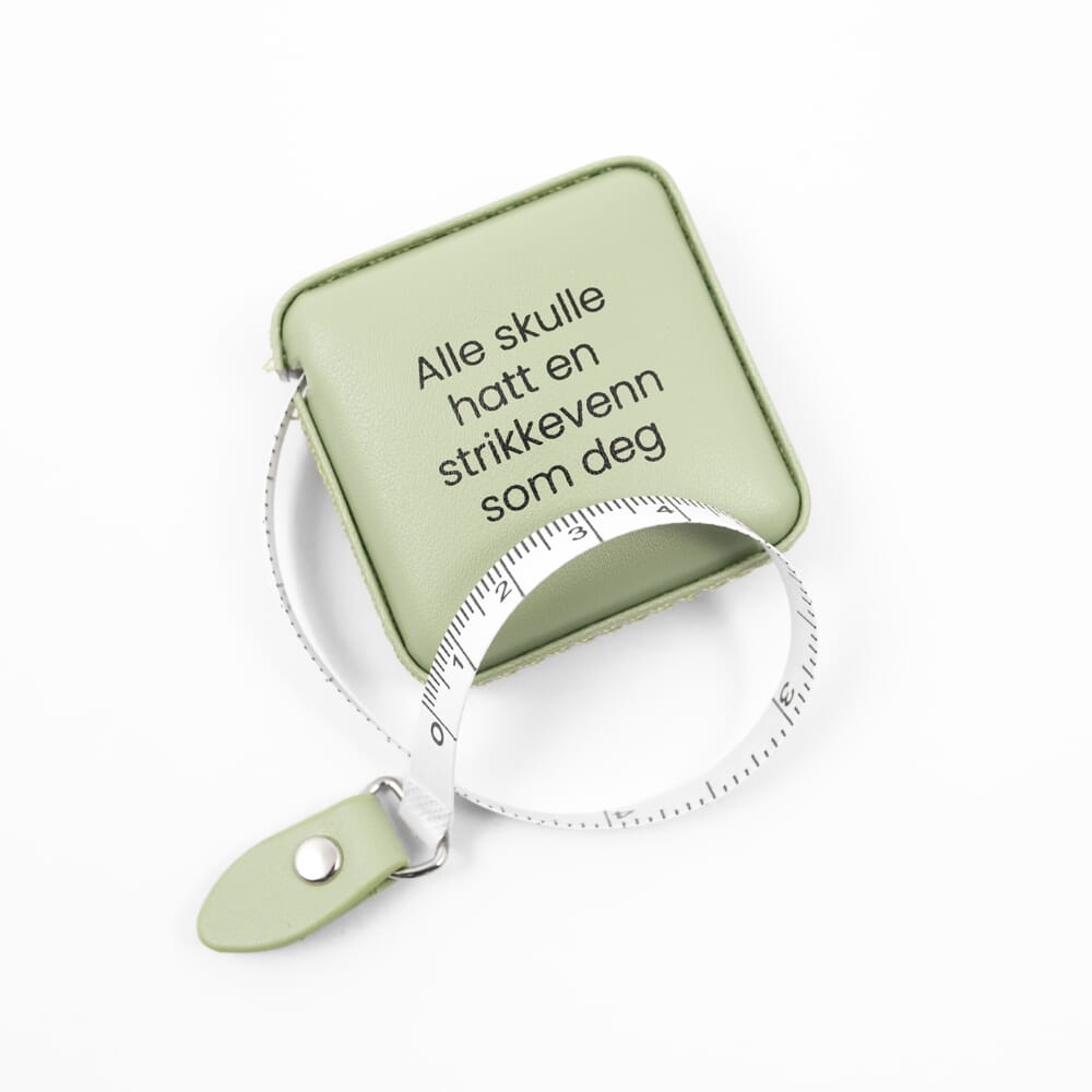 "Målebånd på spole. Måler i cm og tommer, 150cm langt. Alle skulle hatt en strikkevenn som deg."