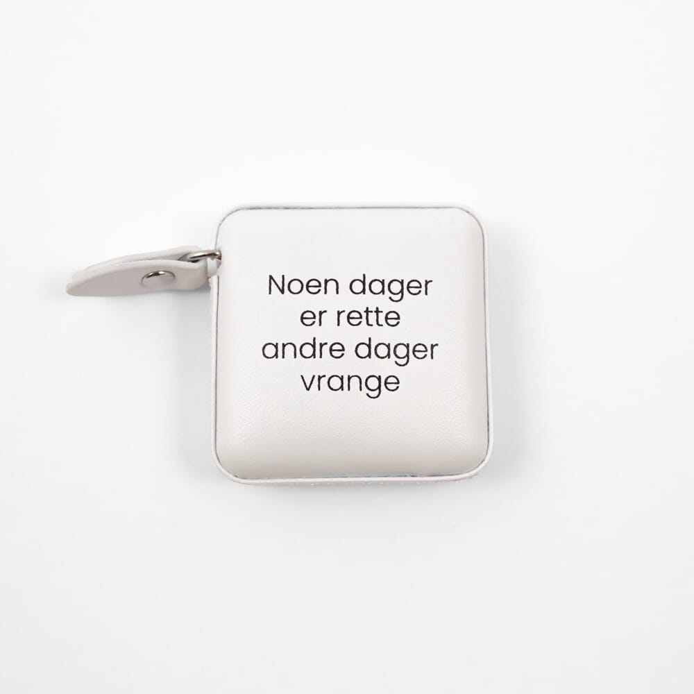 "Målebånd på spole. Måler i cm og tommer, 150cm langt. Noen dager er rette, andre dager vrange."