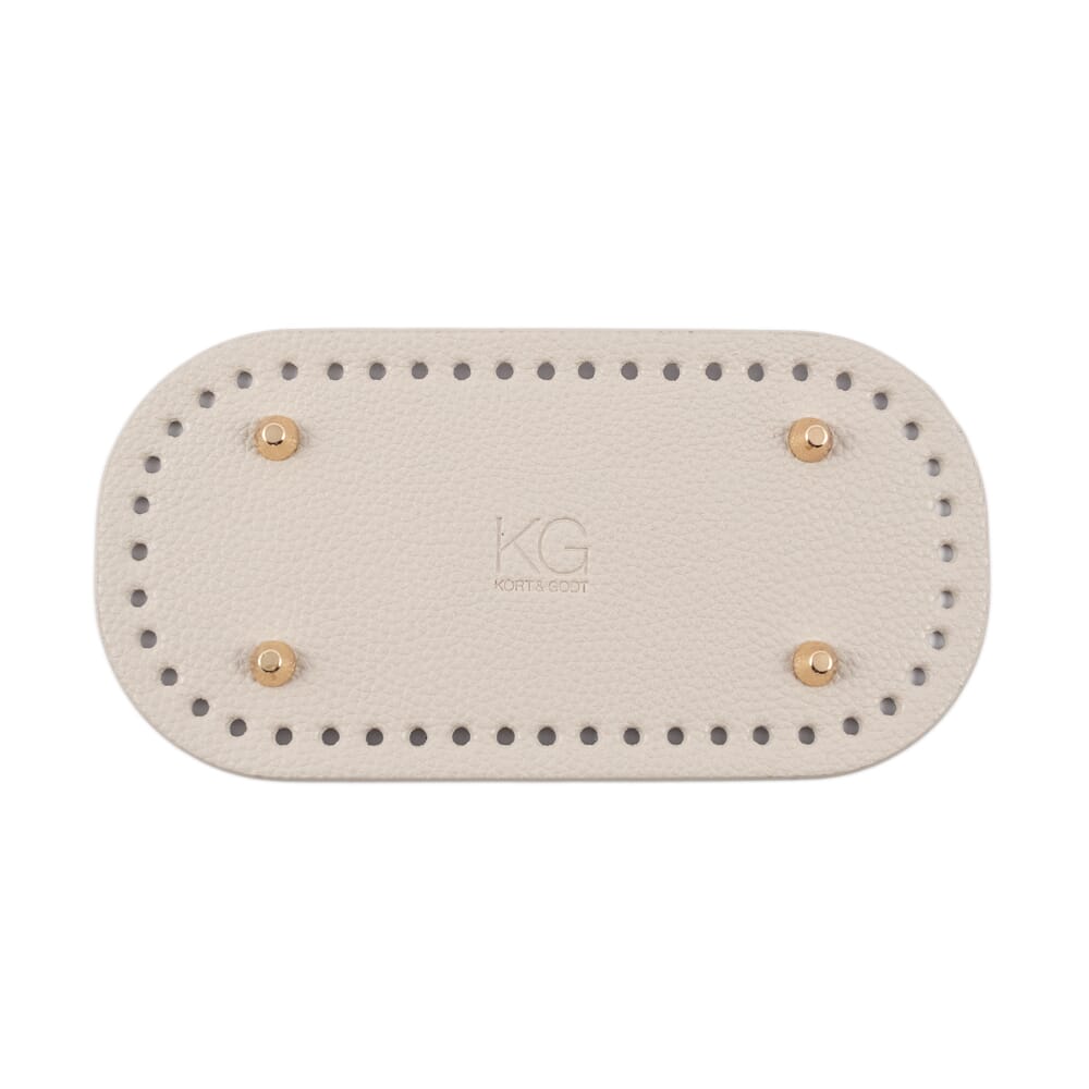 Bunn i PU-skinn til å hekle eller sy på vesker og kurver. Stødig base med 4 gullfargede metallbein på undersiden. Bunnen har 48 små hull(Ø4.5mm) langs kanten. Nikkelfri.