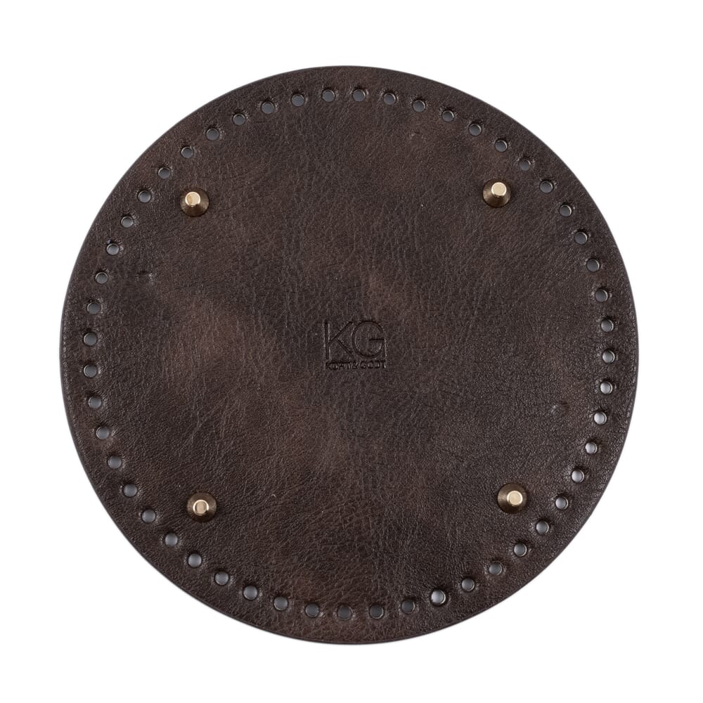 Bunn i PU-skinn til å hekle eller sy på vesker og kurver. Stødig base med 4 gullfargede metallbein på undersiden. Bunnen har 52 små hull(Ø4.5mm) langs kanten. Nikkelfri.