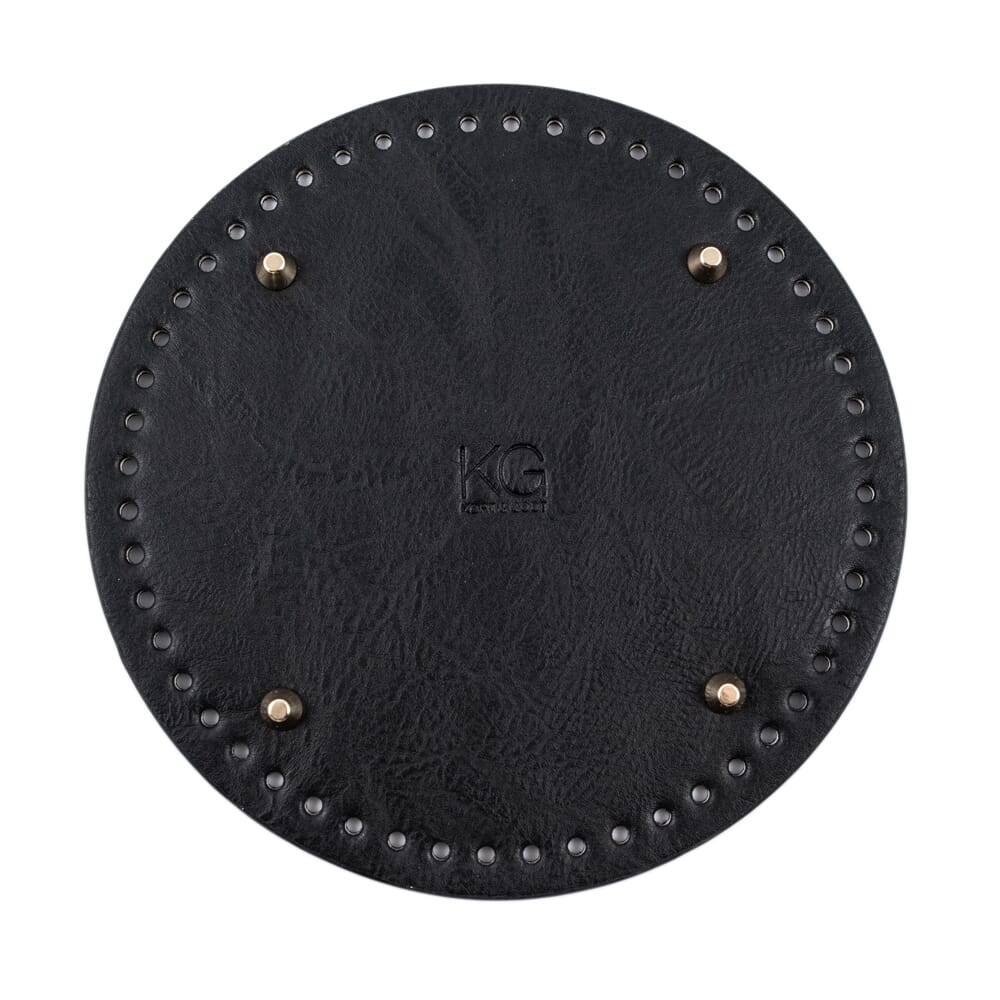 Bunn i PU-skinn til å hekle eller sy på vesker og kurver. Stødig base med 4 gullfargede metallbein på undersiden. Bunnen har 52 små hull(Ø4.5mm) langs kanten. Nikkelfri.