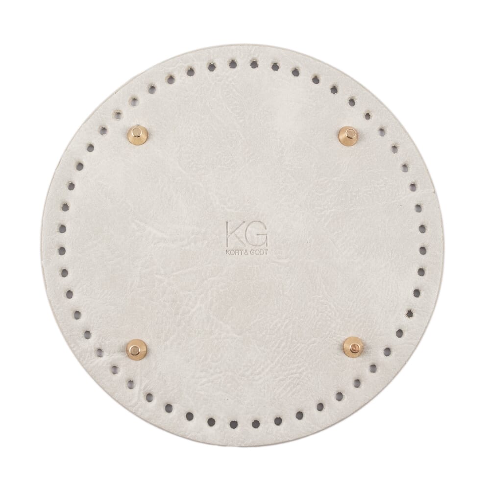 Bunn i PU-skinn til å hekle eller sy på vesker og kurver. Stødig base med 4 gullfargede metallbein på undersiden. Bunnen har 52 små hull(Ø4.5mm) langs kanten. Nikkelfri.