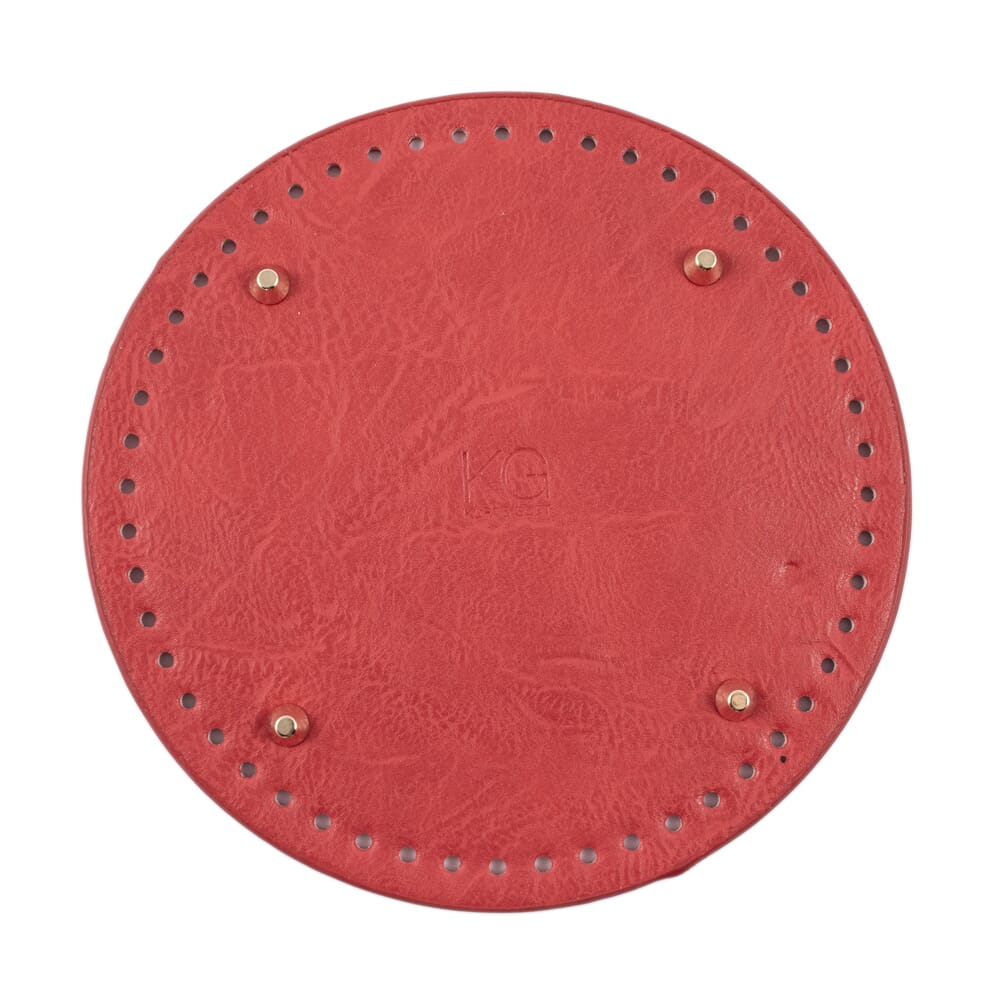 Bunn i PU-skinn til å hekle eller sy på vesker og kurver. Stødig base med 4 gullfargede metallbein på undersiden. Bunnen har 52 små hull(Ø4.5mm) langs kanten. Nikkelfri.
