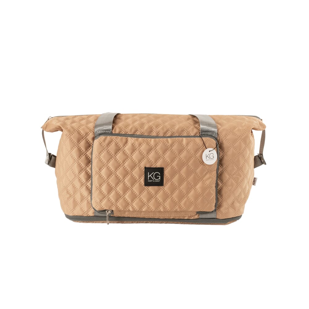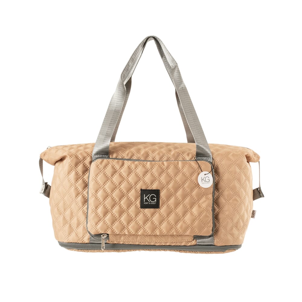 Stor veske i glatt stoff med håndtak. og ekstra lommer utvendig og innvendig. Med bunn som kan utvides, slik at du får enda større veske. Fin til å ha større strikkeprosjekt i.