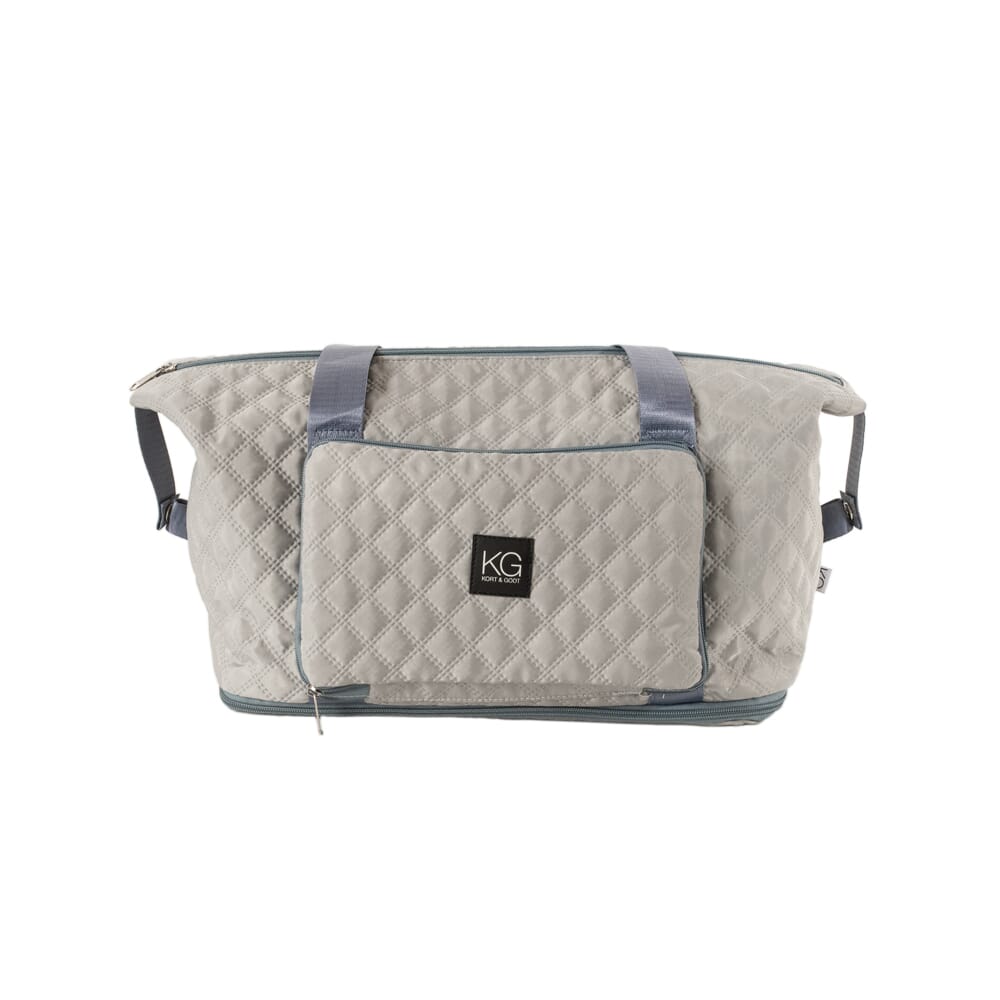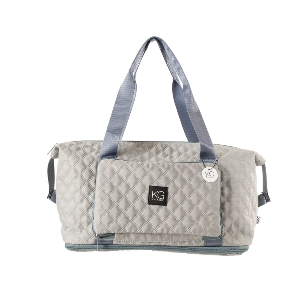 Stor veske i glatt stoff med håndtak. og ekstra lommer utvendig og innvendig. Med bunn som kan utvides, slik at du får enda større veske. Fin til å ha større strikkeprosjekt i.