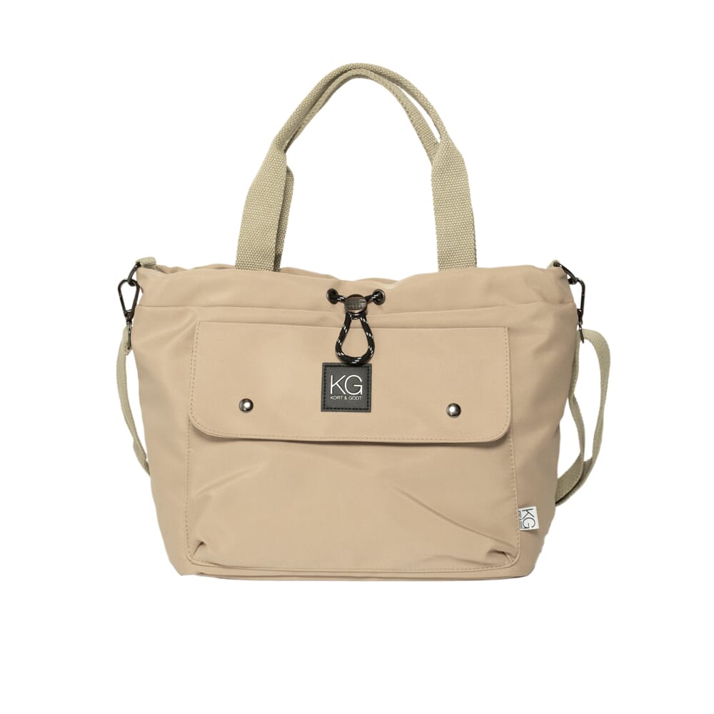 Veske i stoff. med håndtak og utvendig/innvendige lommer. Lukkes med snor og magnetlås. Fin til å ha strikkeprosjekter og tilbehør i.