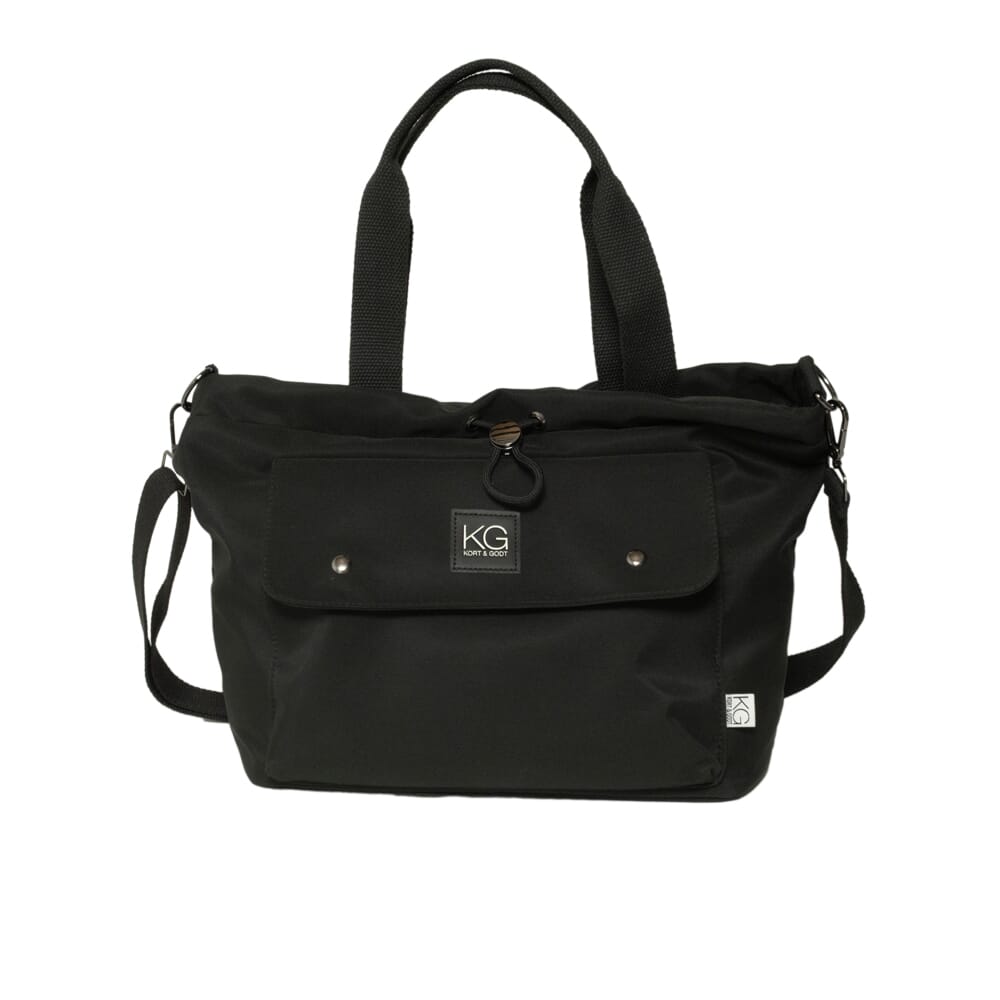 Veske i stoff. med håndtak og utvendig/innvendige lommer. Lukkes med snor og magnetlås. Fin til å ha strikkeprosjekter og tilbehør i.