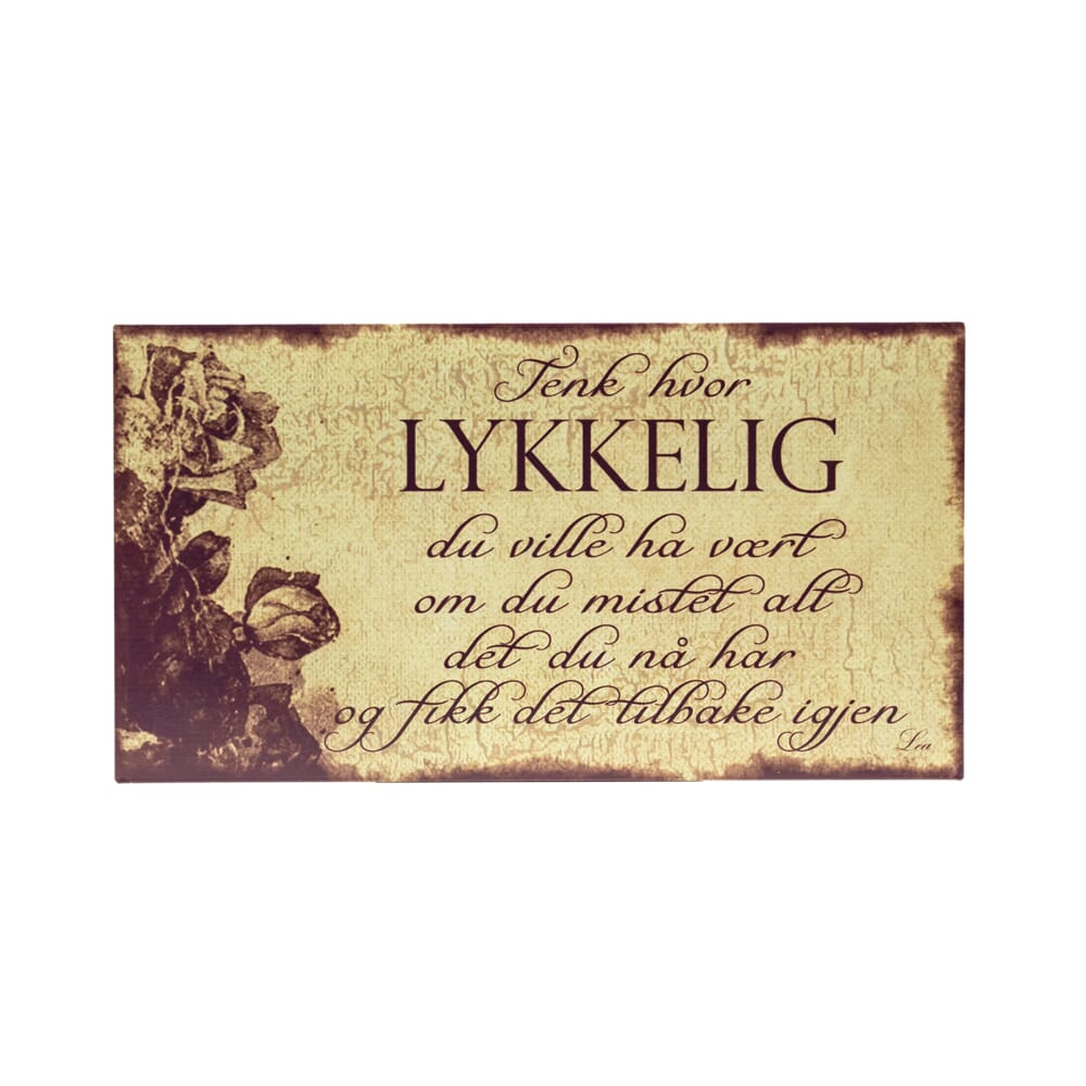 Metallskilt med norske tekster. Tenk hvor lykkelig du ville vært om du mistet alt det du nå har. og fikk det tilbake igjen.