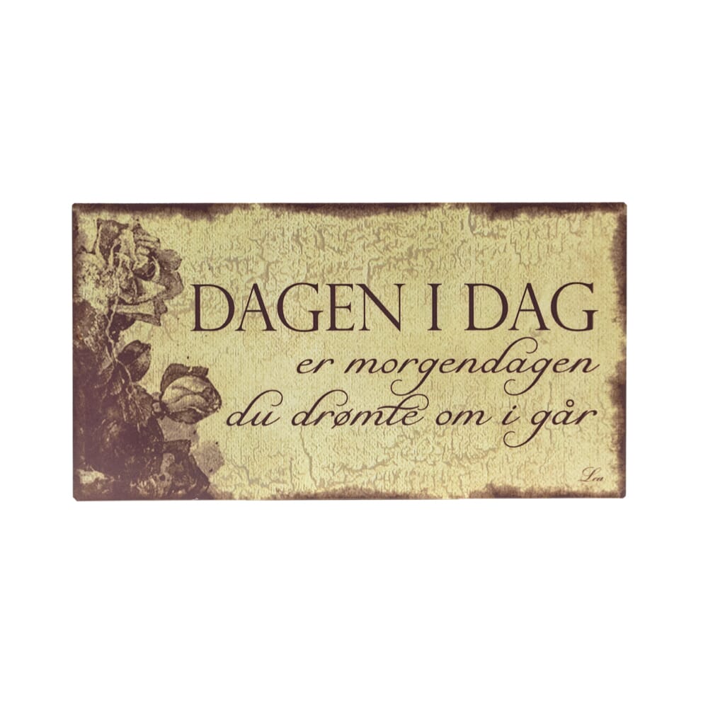 Metallskilt med norske tekster. Dagen i dag er morgendagen du drømte om i går.