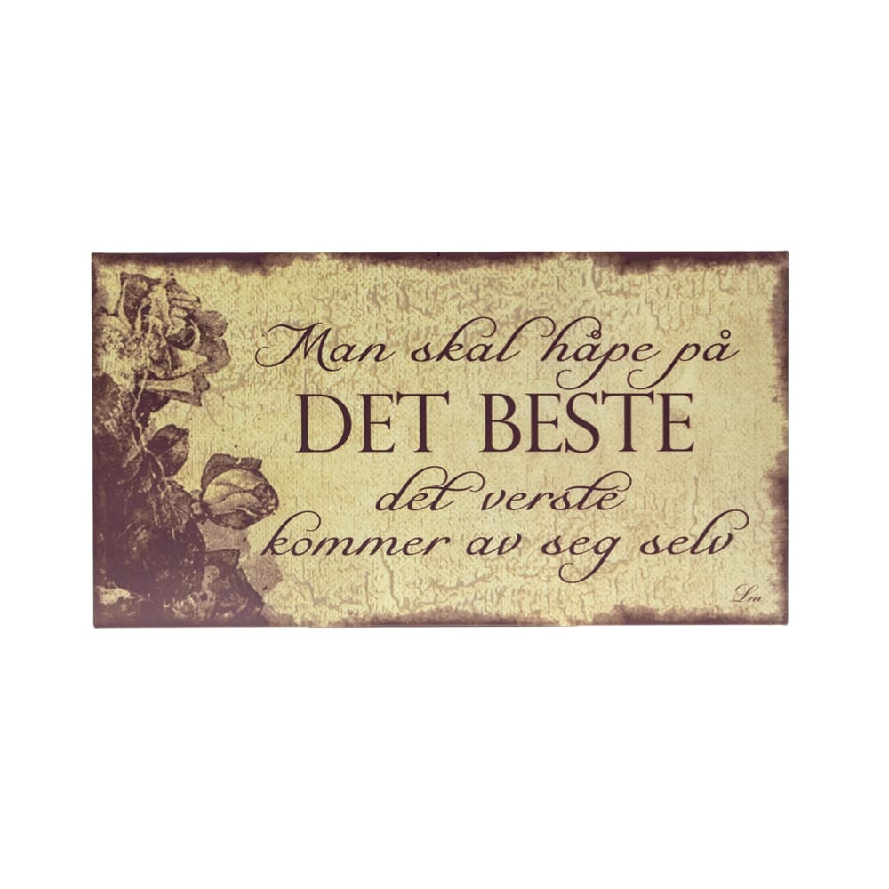Metallskilt med norske tekster. Man skal håpe på det beste. det verste kommer av seg selv.