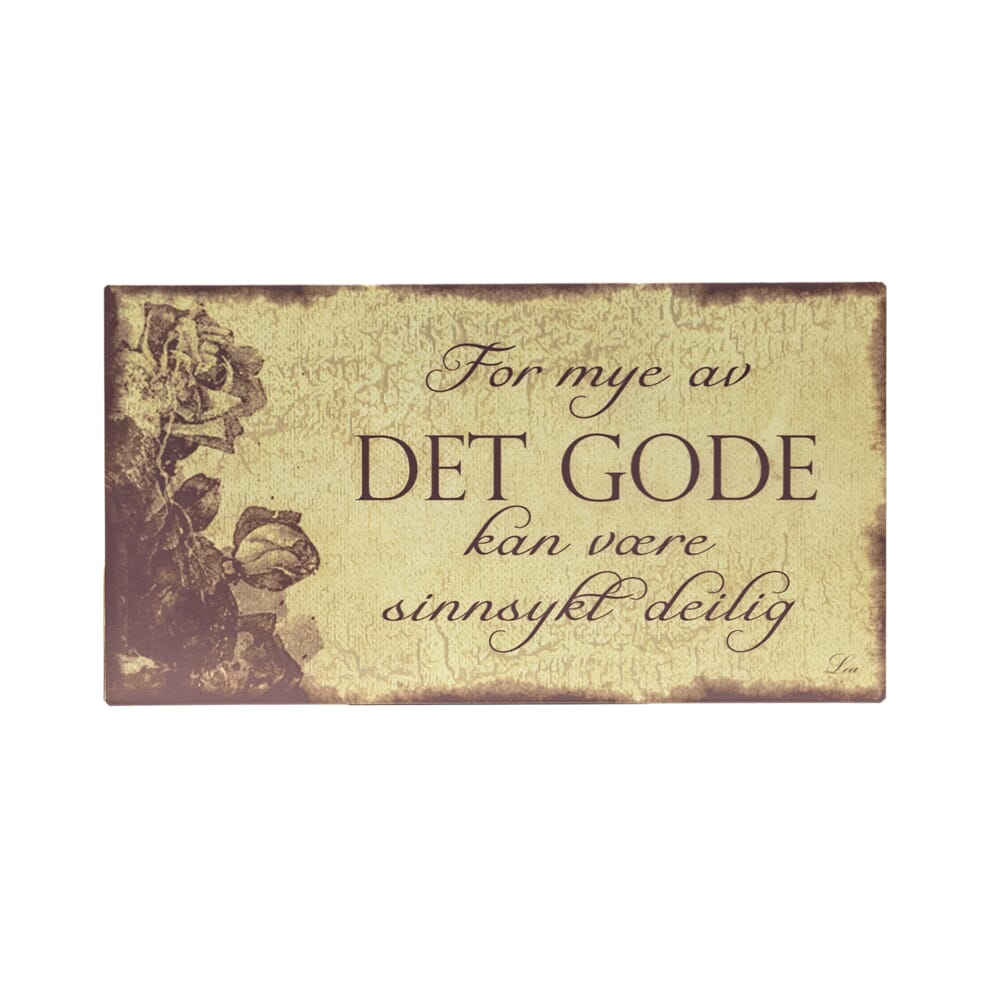 Metallskilt med norske tekster. For mye av det gode kan være sinnsykt deilig.