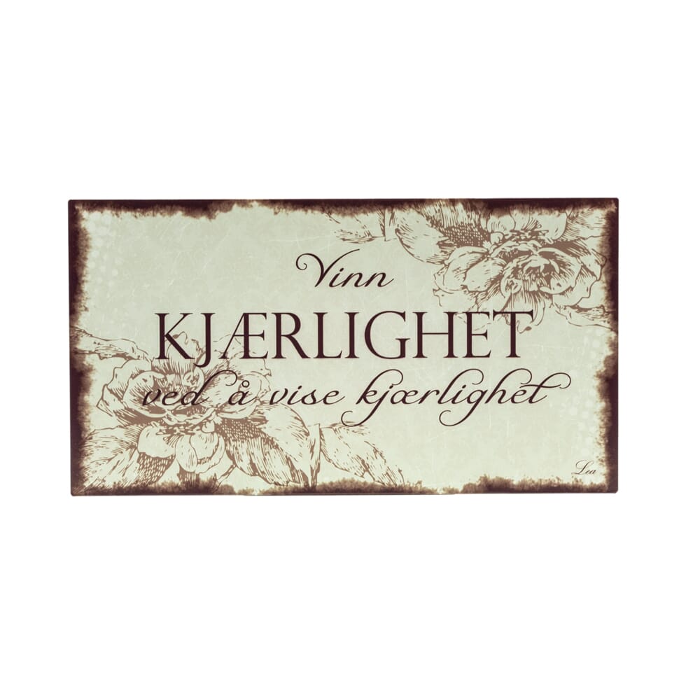 Metallskilt med norske tekster. Vinn kjærlighet ved å vise kjærlighet.