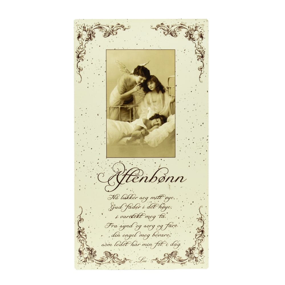 Metallskilt med norske tekster. Aftenbønn. Nå lukker seg mitt øye.
