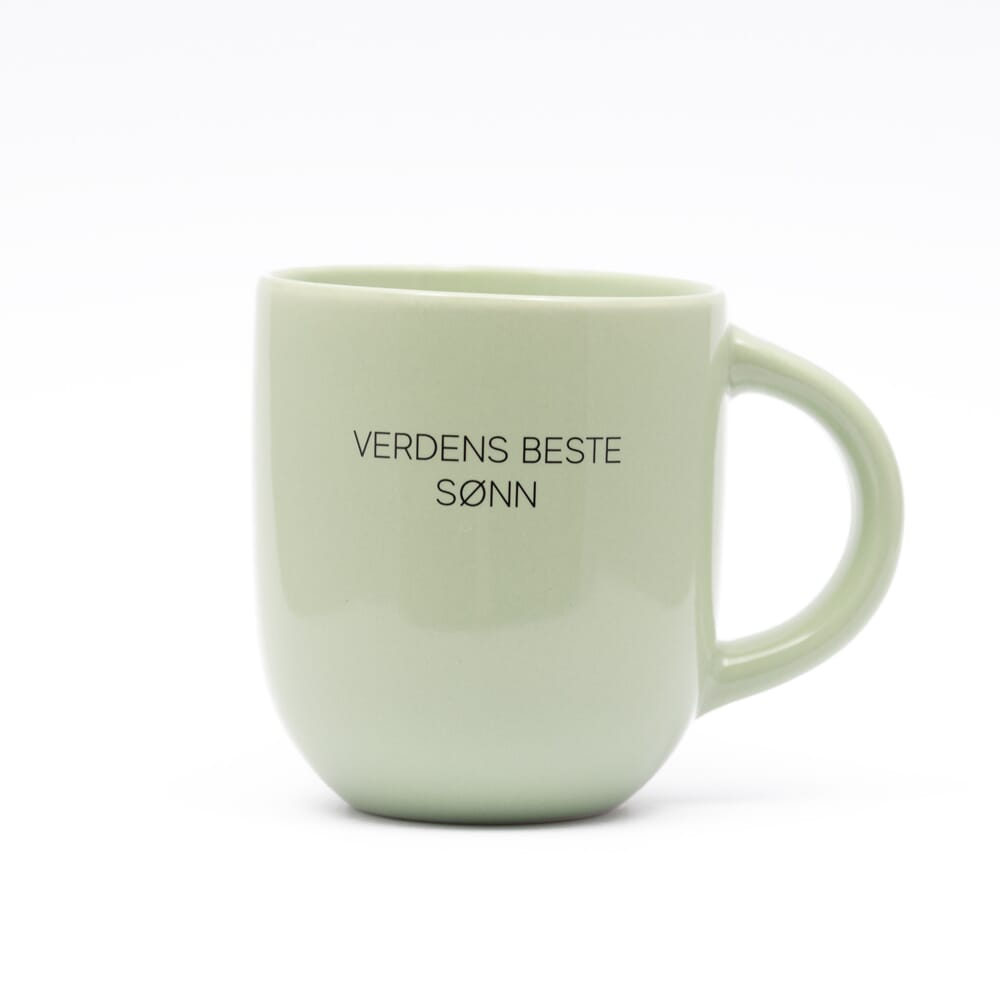 Kopp i keramikk med norsk tekst og motiv