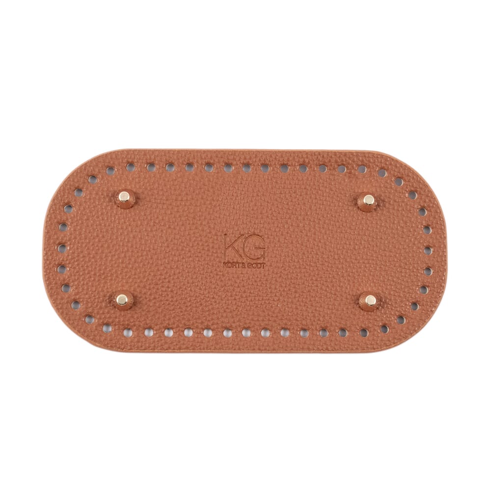 Bunn i PU-skinn til å hekle eller sy på vesker og kurver. Stødig base med 4 gullfargede metallbein på undersiden. Bunnen har 48 små hull(Ø4.5mm) langs kanten. Nikkelfri.
