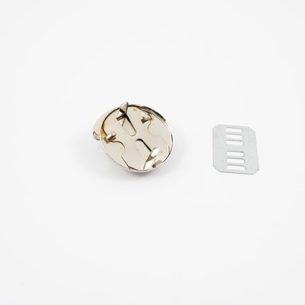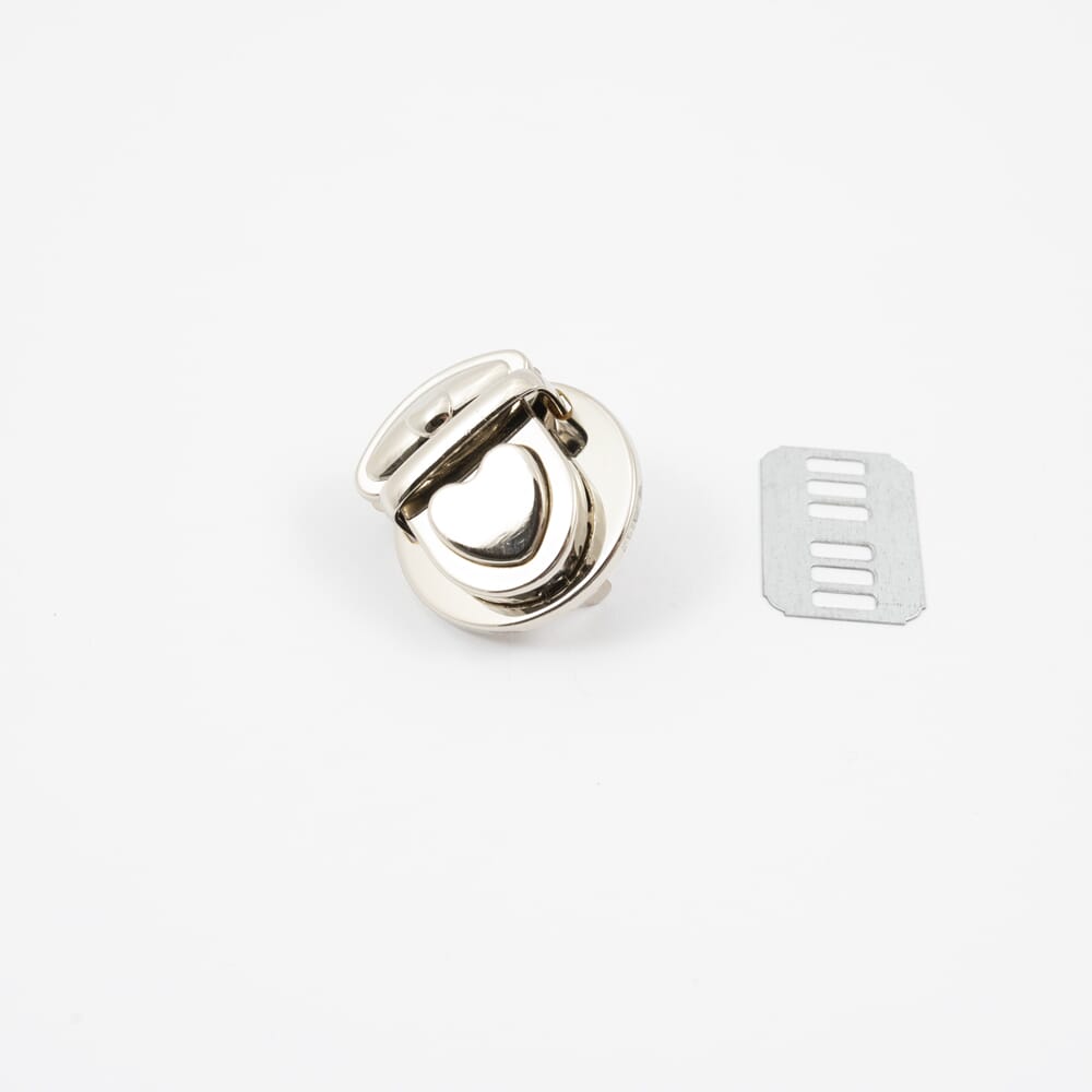 Veskelås i metall. Festes gjennom stoffet med en plate på baksiden. Toppen klemmes fast rundt kanten på veskelokket. Nikkelfri.