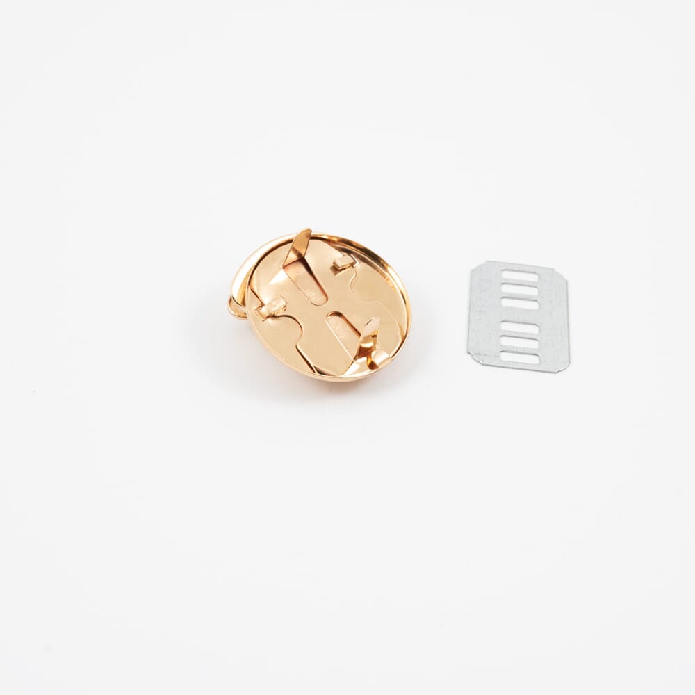 Veskelås i metall. Festes gjennom stoffet med en plate på baksiden. Toppen klemmes fast rundt kanten på veskelokket. Nikkelfri.