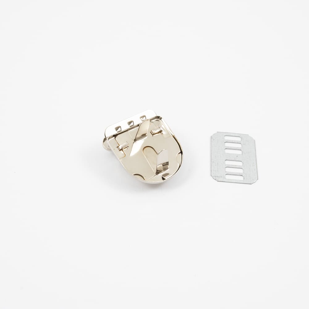Veskelås i metall. Festes gjennom stoffet med en plate på baksiden. Toppen klemmes fast rundt kanten på veskelokket. Nikkelfri.
