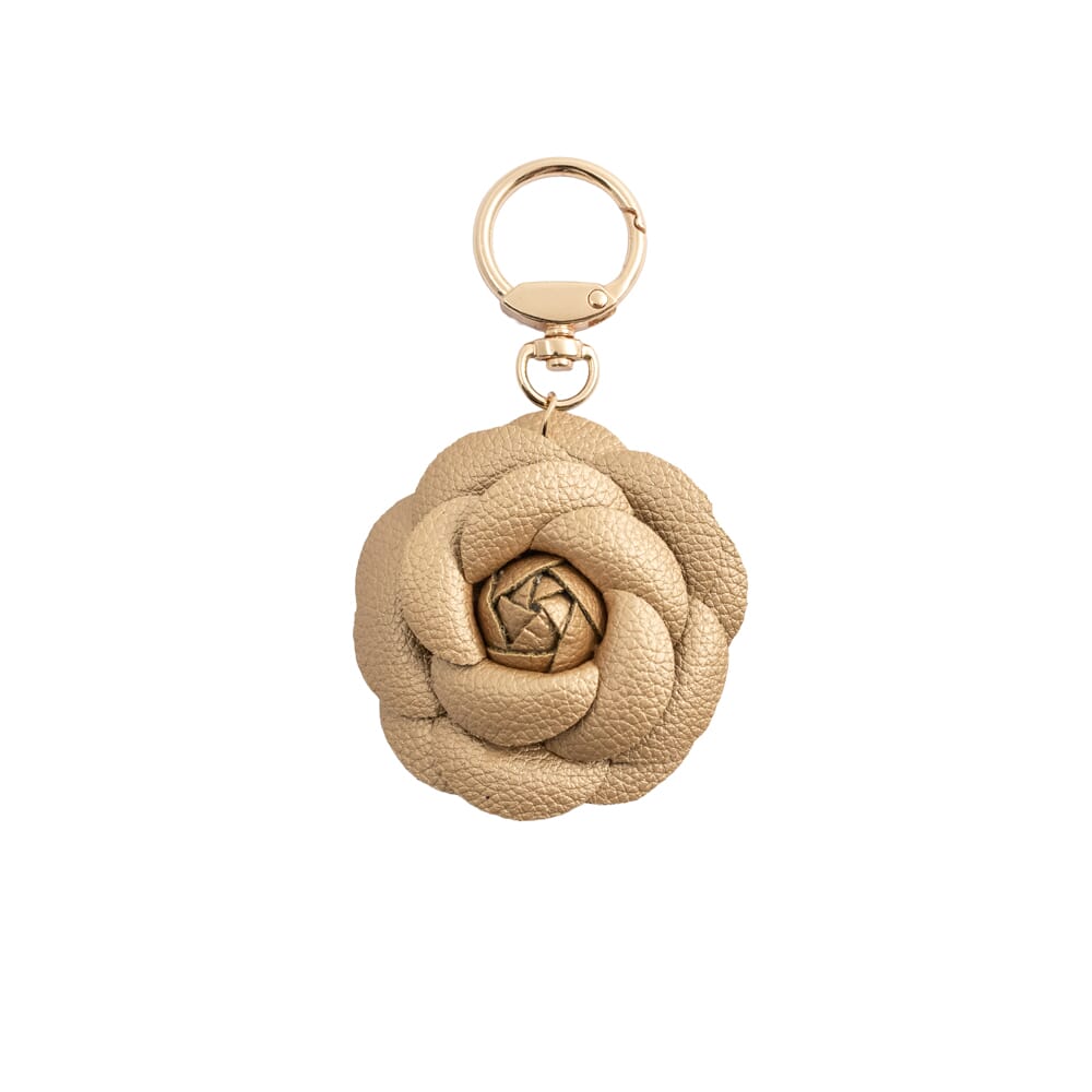 Veskepynt i imitert skinn og gullfarget metall. Praktisk karabinkrok til å feste den til veske. ryggsekk eller nøkler. Nikkelfri.