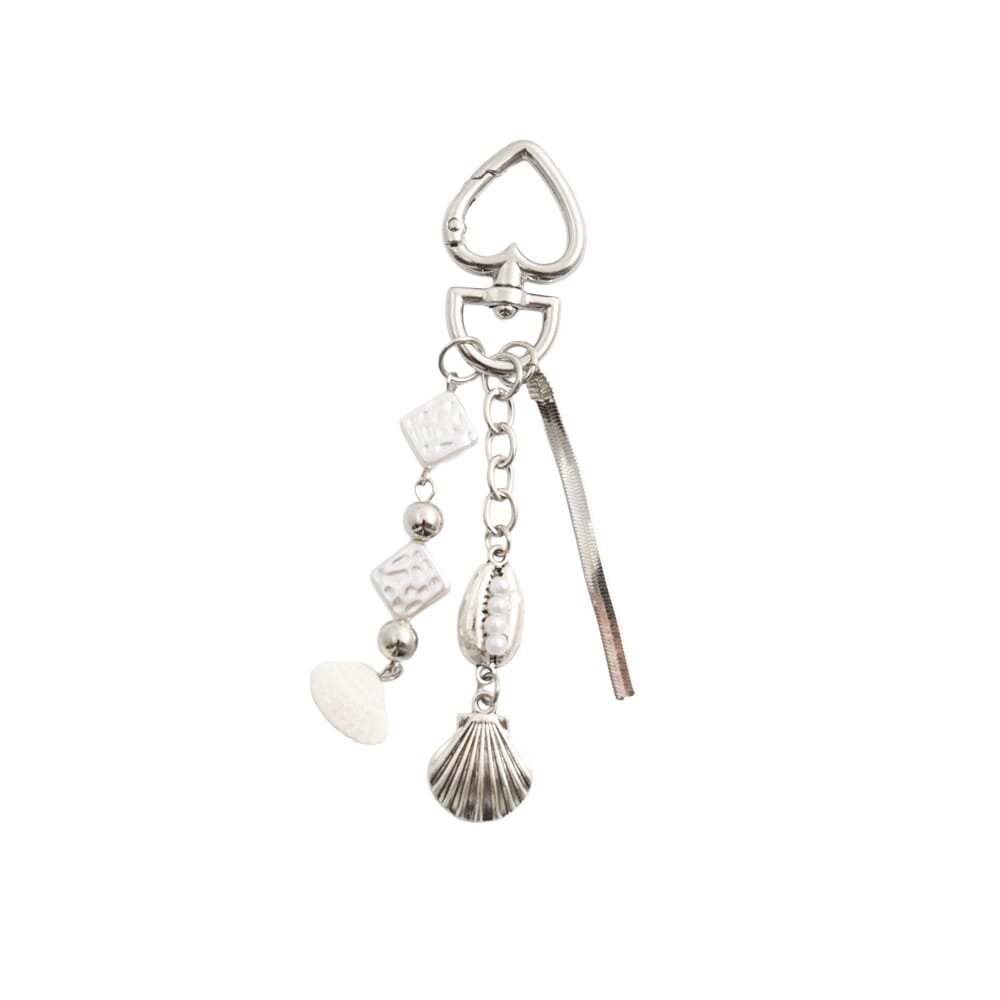 Veskepynt med perler. skjell og gullfarget metall. Praktisk karabinkrok til å feste den til veske, ryggsekk eller nøkler. Nikkelfri.