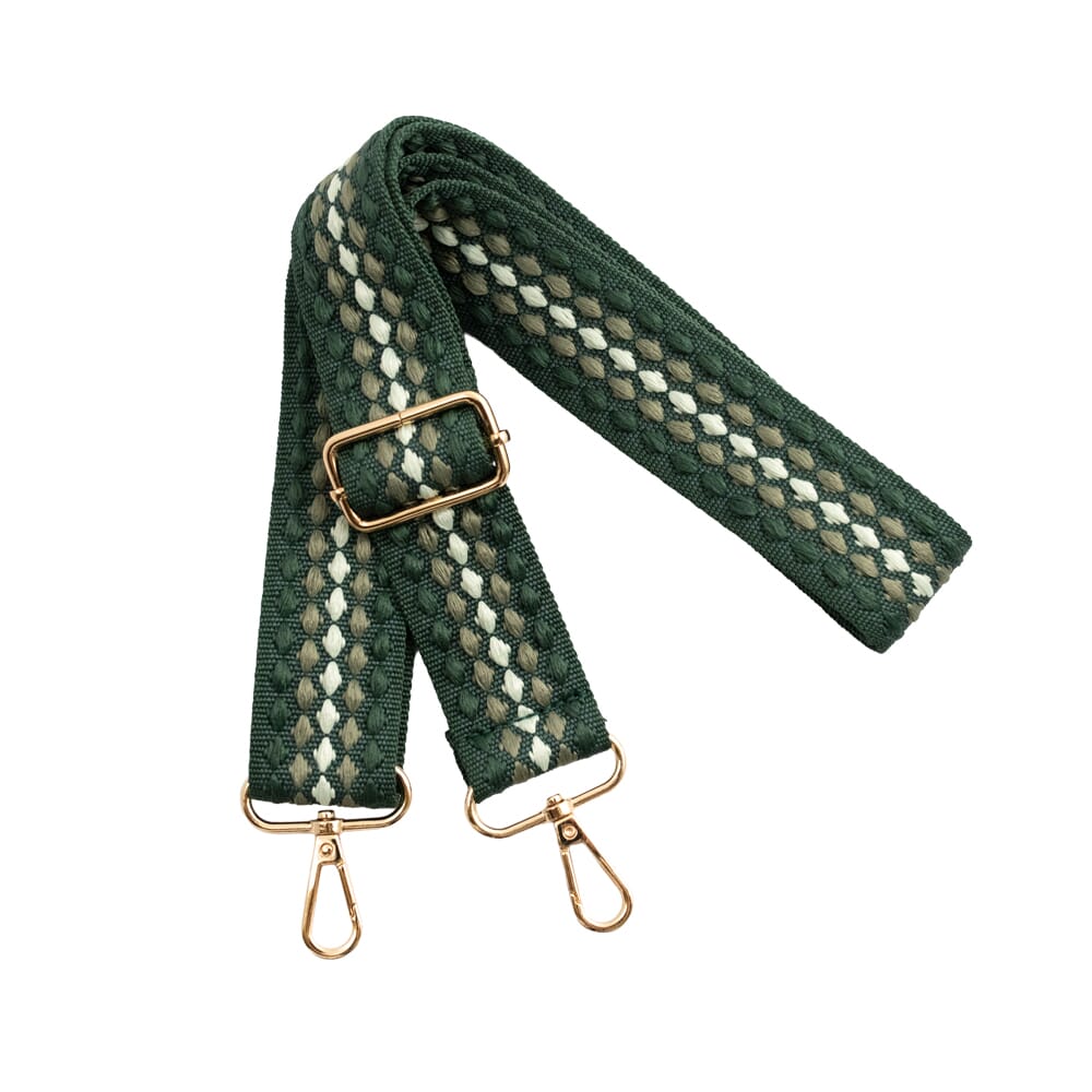 Justerbar reim i vevd polyester. med gullfarget kroker og spenne. Kan justeres mellom 70 og 130cm lang og er 3,8cm bred. Nikkelfri.