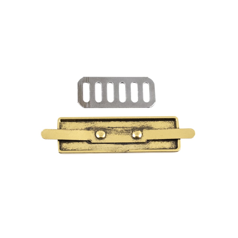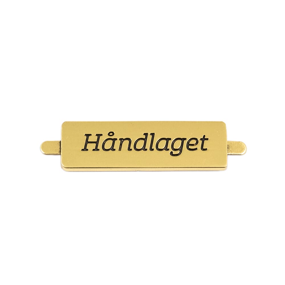 Metallmerke i rustfri sinklegering. nikkelfrie. Kan brukes på vesker og stoff. Det følger med en bakplate til å feste merket med.